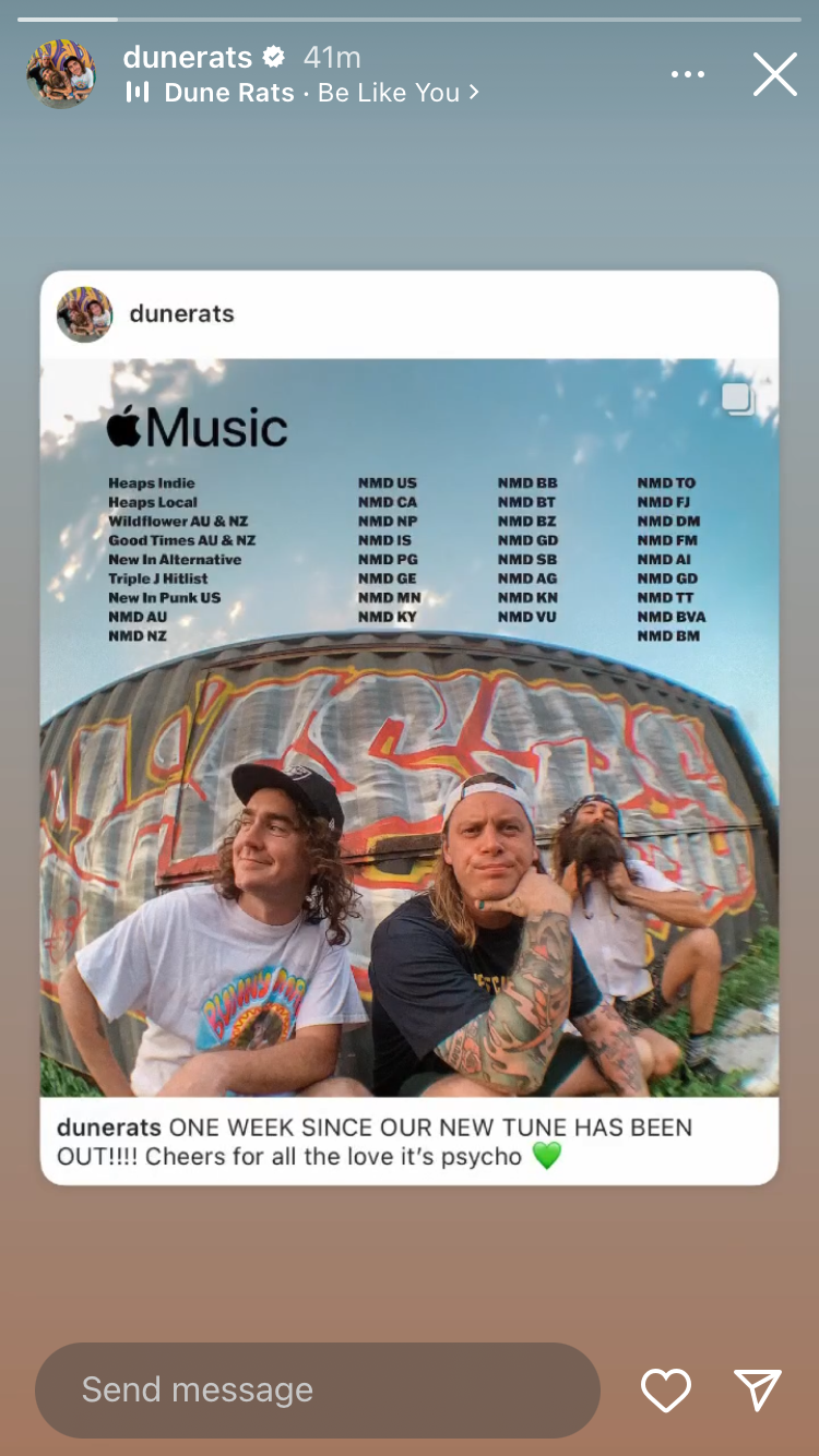 Instagram post highlighting DSP play-listing for Dune Rats' new song Be Like You.